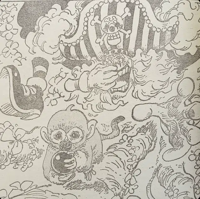 Saturne essaie de piétiner Luffy mais Franky tend le bras et sauve son capitaine, Luffy est toujours conscient mais il ne dit rien dans ce chapitre. Vegapunk, Bonney, Sanji et Franky sont incapables de bouger à cause du pouvoir mystérieux de Saturne.