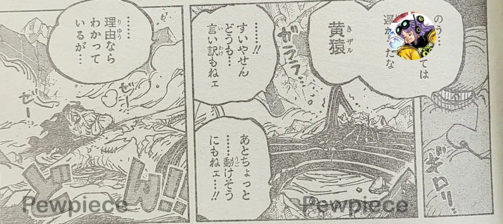 Saturne attaque Bonney et Sanji en émettant une aura de ses yeux. Bonney et Sanji sont frappés à la tête et du sang sort, mais leurs têtes n’explosent pas. Kizaru s’excuse auprès de Saturne, il est toujours au sol incapable de bouger.